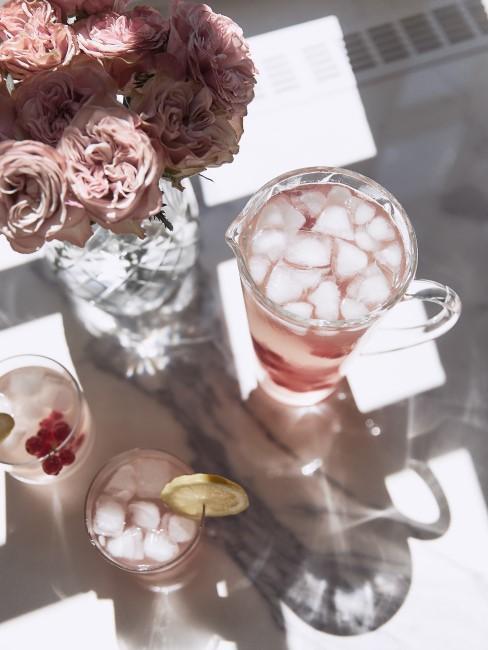 Biała sypialnia z łóżkiem z różową pościelą, stolikiem z wazonem oraz dekoracyjnymi obrazkami