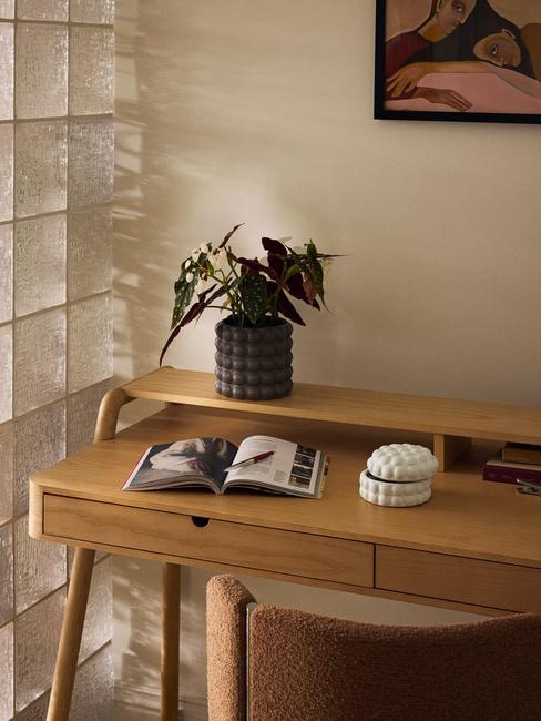 małe biurko w sypilani przy skórzanym krześle z monsterą na blacie