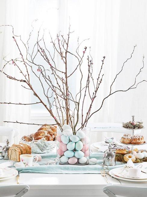 zbliżenie na minimalistyczny wielkanocny stół z nutą skandi w bieli