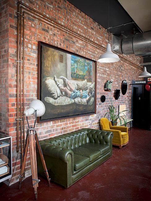 salon w stylu industrialnym z motywami country i rogami na ścianie