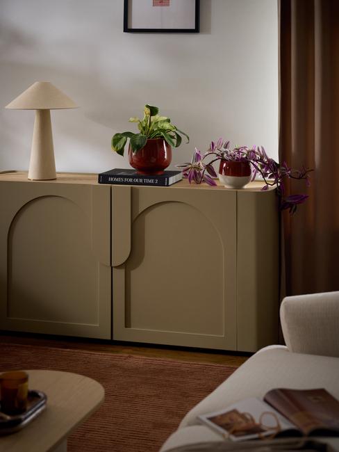 mała lampka ze zwisającym kablem stojąca na półce w salonei