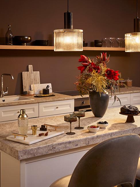 Kuchnia w stylu glmour z wyspą z marmuru i zieloną ścianą