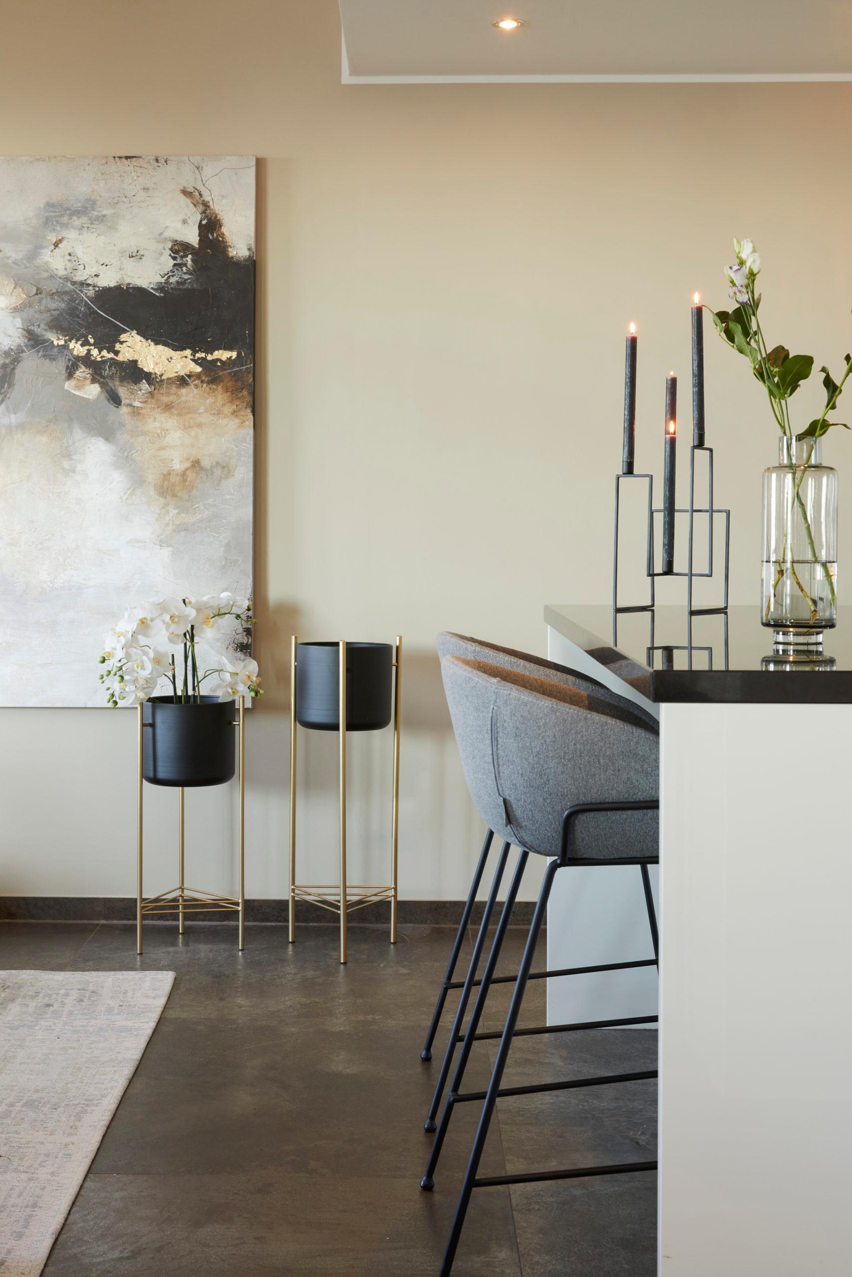 Stolik kawowy ze świecznikami oraz dużą rośliną w donicy.
