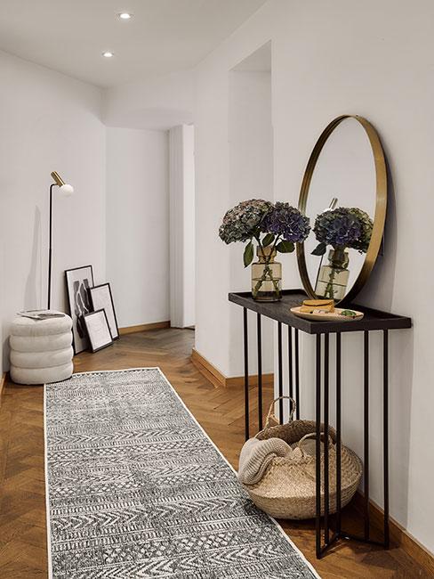 Duże mieszkanie w kamienicy z jasną podłogą z zieloym dywanem i galerią zdjęć w przedpokoju