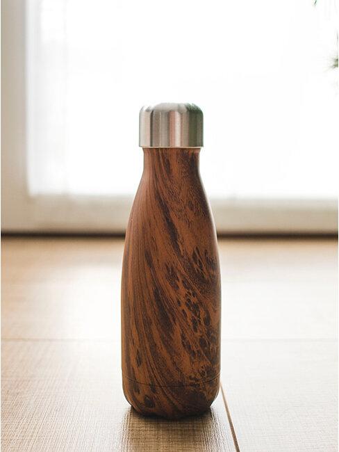Zbliżenie na drewnianą komodę w pomieszczeniu z lustrem, kosmetykami oraz wazonem