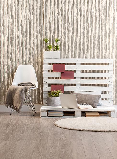 biała tapicerowana sofa z poduszkami w delikatne pasy obok drewnianego stolika