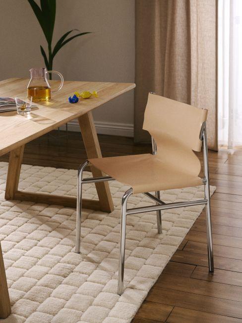 Zbliżenie na jasną sofę z poduszkami, beżowo-czarnym dywanem, jutowym pudem i małym stoliczkiem