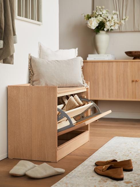 salon beżowy w stylu boho z drewnianymi meblami i dodatkami