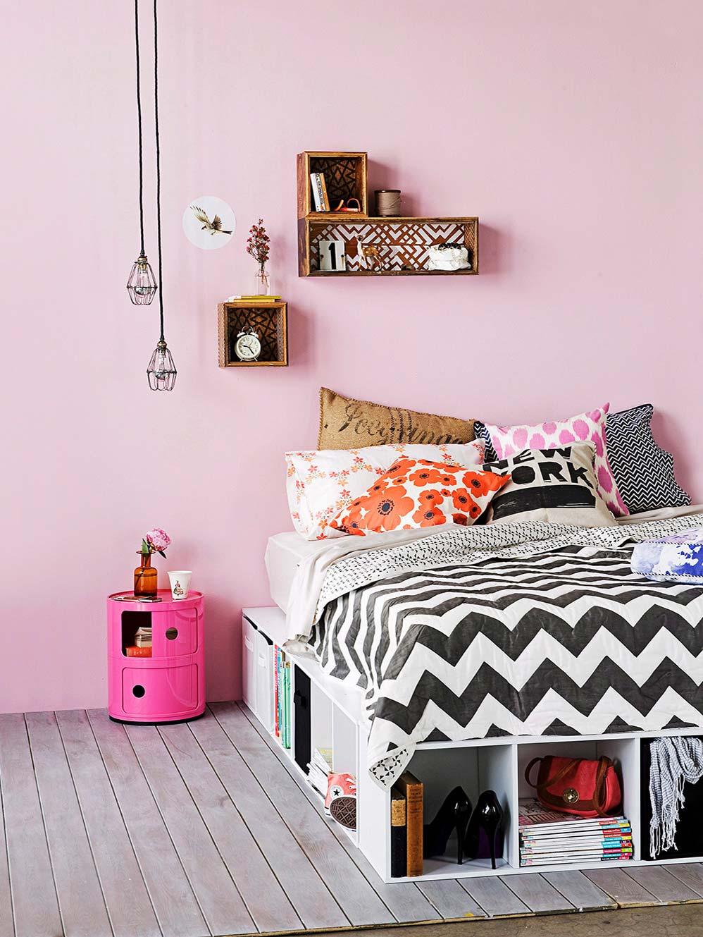 zbliżenie na sofę w kolorze fuksji na tle beżowej ściany