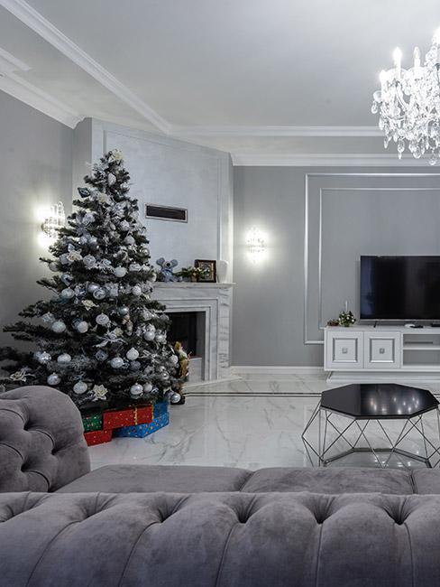 Salon z szarą kanapą, drewnianym stolikiem kawowym, lustrem oraz krzesłem ze stołem