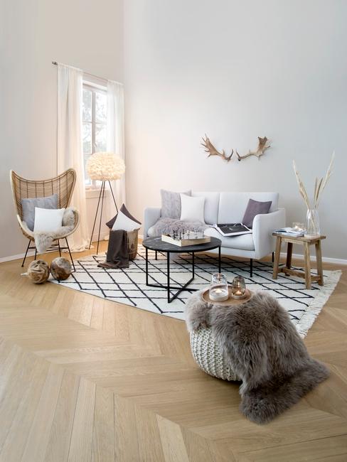 Wnętrze salonu z beżową sofą i drewnianym stolikiem kawowym