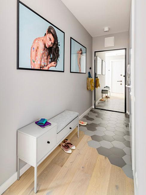 Ozdoby na kredensie w przedpokoju, ramka na zdjęcie i liście w wazonie