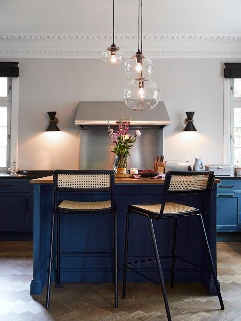 Kuchnia w stylu modern classic. Meble w kolorze taupe i błękitne dodatki