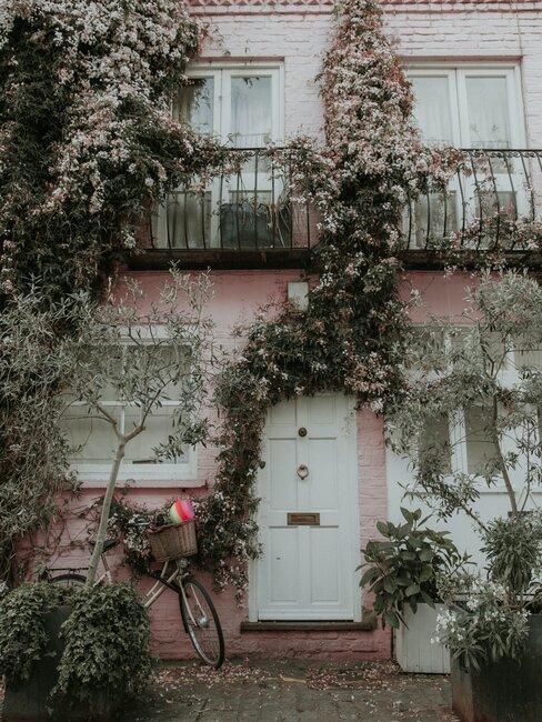 Biała sypialnia z łóżkiem o szarej ramie, różowym pledem, różowym pufem oraz lampkami cotton balls