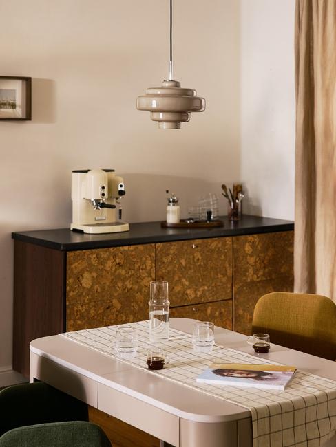 biały stół w jadalni w stylu skandynawskim z niebieskimi akcentami