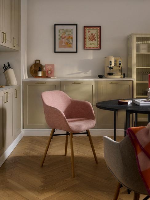 Kącik w salonie z białym fotelem i poduszką z aksamitu w kształcie cukierka na tle postaronej ściany