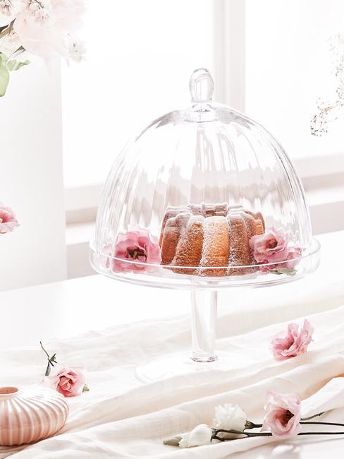 Truskawki z jogurtem w pucharku na stole obok wazonu z białymi kwiatami