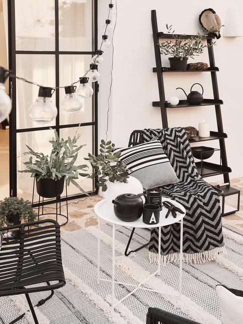 taras w stylu boho z jasnymi meblami z bambusa i makramą na ścianie