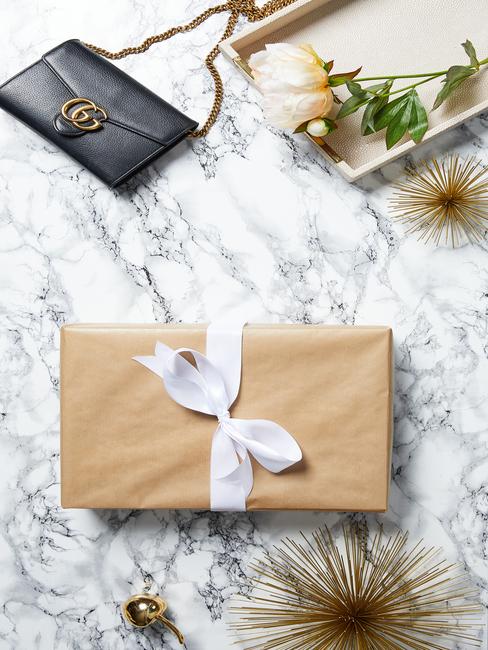 Świąteczna taca dekoracyjna z bombkami choinkowymi, świeczką oraz małymi choinkami na komodzie