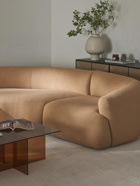 Kanapa w grafitowym kolorze na tle ściany w jasnym ciepłym beżu, biała komoda i dodatki w odcieniach ziemi