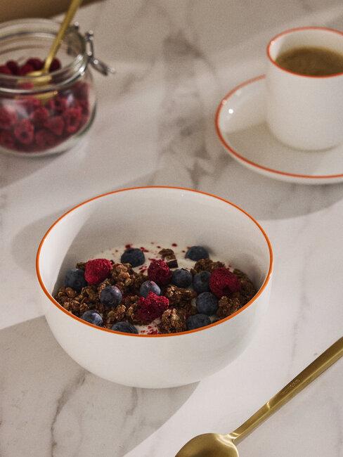 owsianka z owocami i nasionami chia, a obok ciasto na talerzu