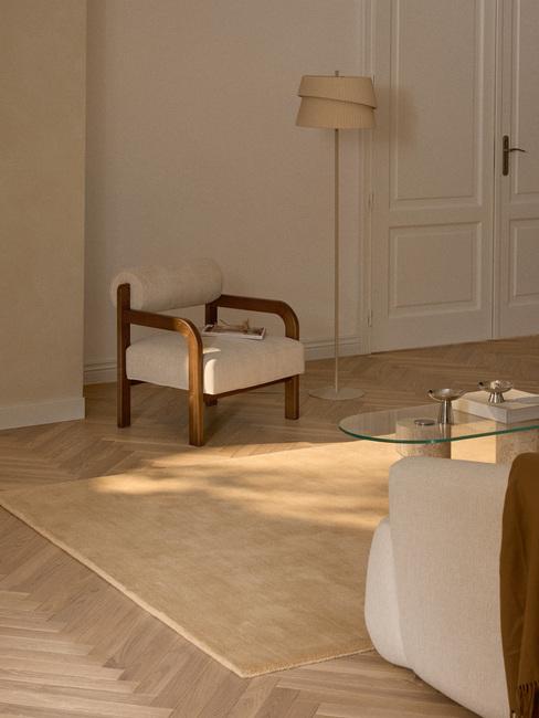 Lampa podłogowa w kolorze taupe stojąca obok beżowego fotela