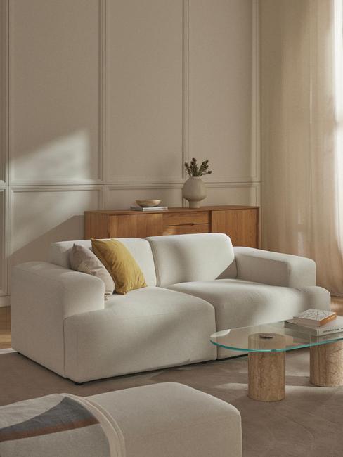 Salon z beżowymi ścianami, stolikiem i świeczkami