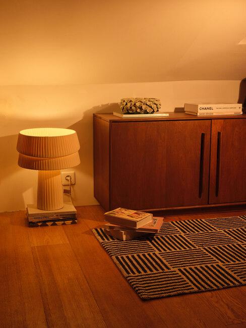 wazon w kolorze bursztynowym z jesiennymi liśćmi na komodzie