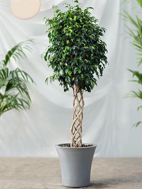 salon z malinową i białą ścianą oraz złotymi stojakami na doniczki