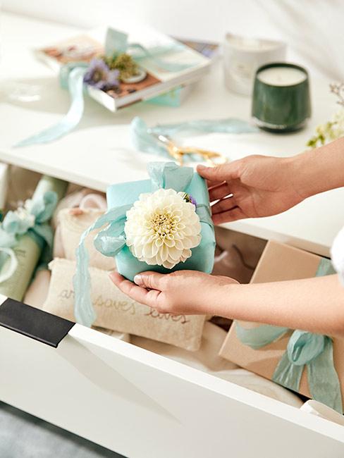 Nahaufnahme Esstisch mit weiß-goldener Tischdeko und selbstgemachtem Kuchen