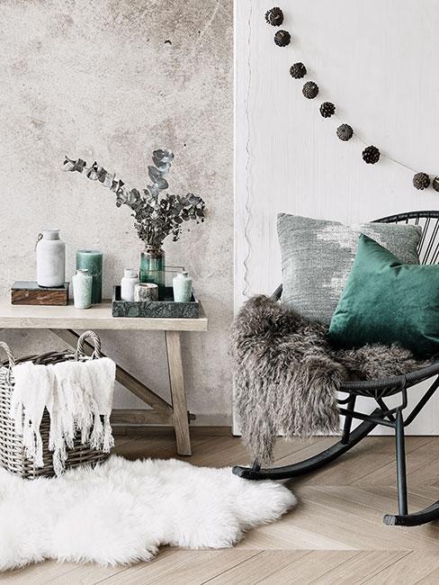 mały szary salon w stylu country z ażurowym fotelem i dekoracjami z futra