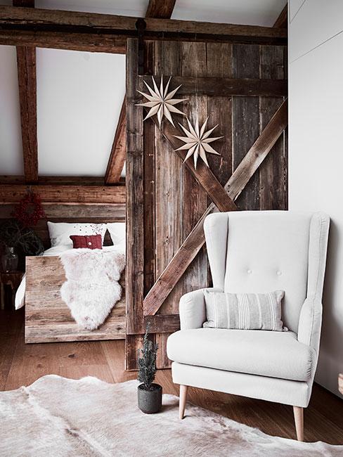 Przytulny kącik w salonie z futrzanymi termoforami z dekoracją świąteczną na oknie