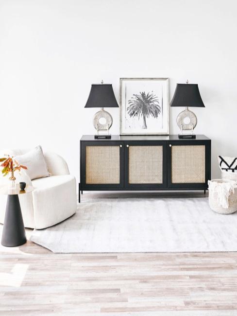 Zbliżenie na minimalistyczną szarą szafkę nocną i czarną lampę obok łóżka z białą pościelą