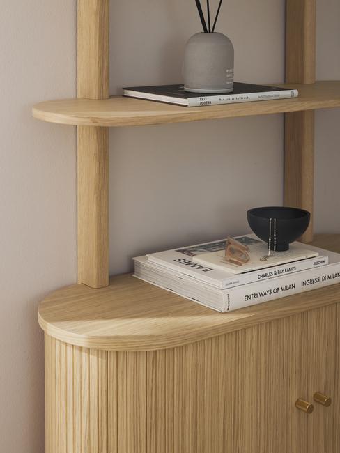 wystawka z humorystycznych pastelowych dekoracji, wazonów i świeczek na jasnej komodzie z plecionki wiedeńskiej pod lustrem w kształcie kałuży