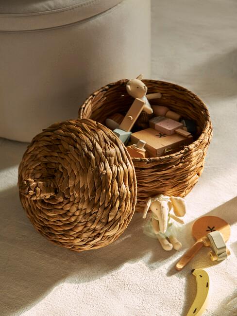 Kosz wiklinowy z lawendą na zielonej ławce obok fioletowego pledu
