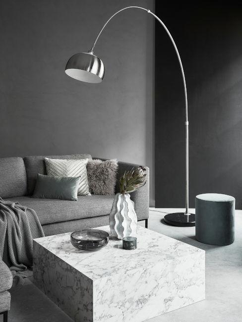 Salon urządony w jasnych tonach taupe z sofą i stolikiem kawowym