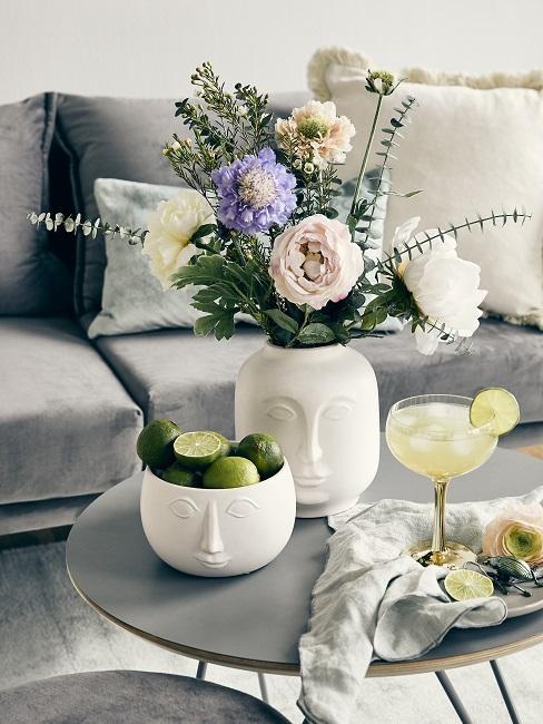 Świeczki i wazoniki na stole w beżowym, przytulnym salonie