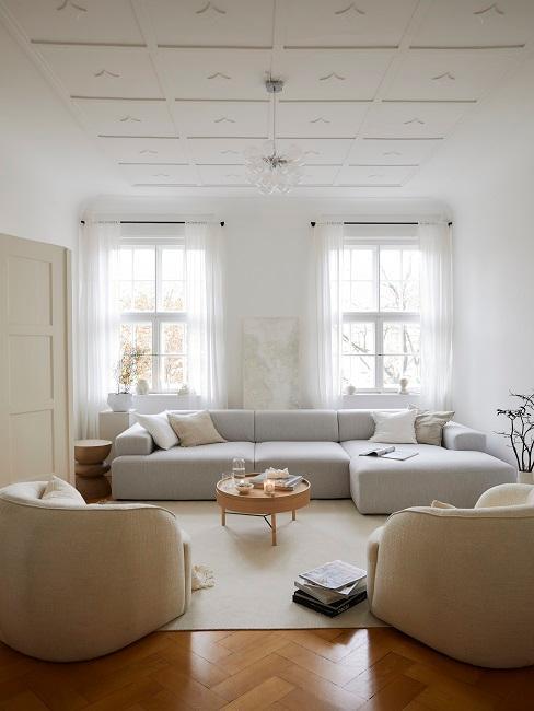 biały fotel uszak boucle przy szarej sofie w modnym wnętrzu