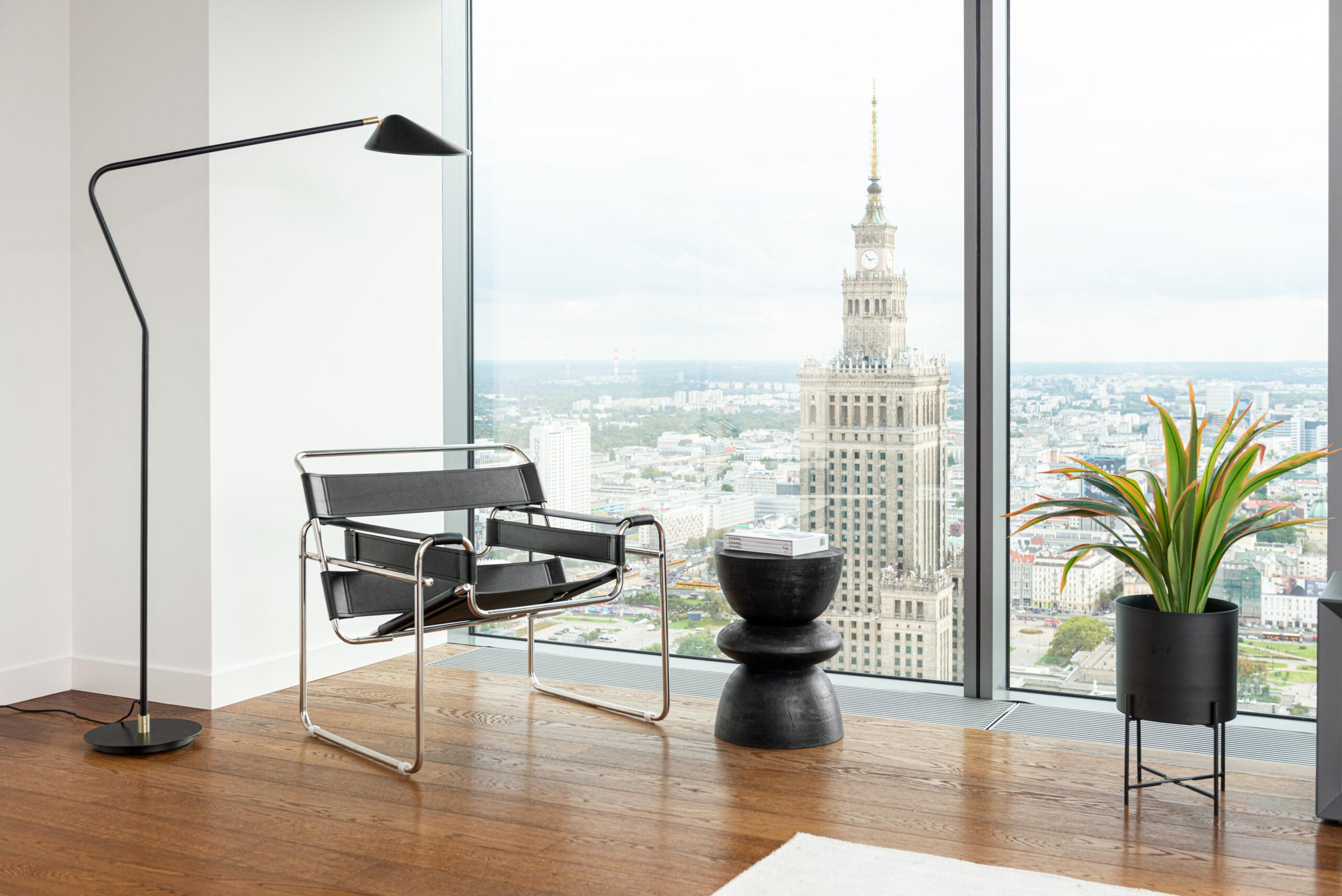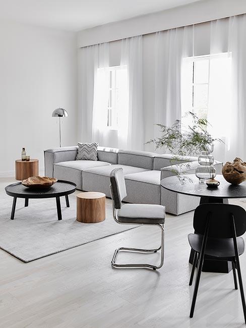 Salon z jasną kanapą i dużą strelicją w doniczce