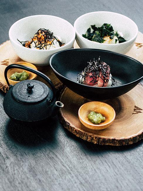 szara ściana z tynkiem dekoracyjnym w kuchni z czarnymi akcesoriami