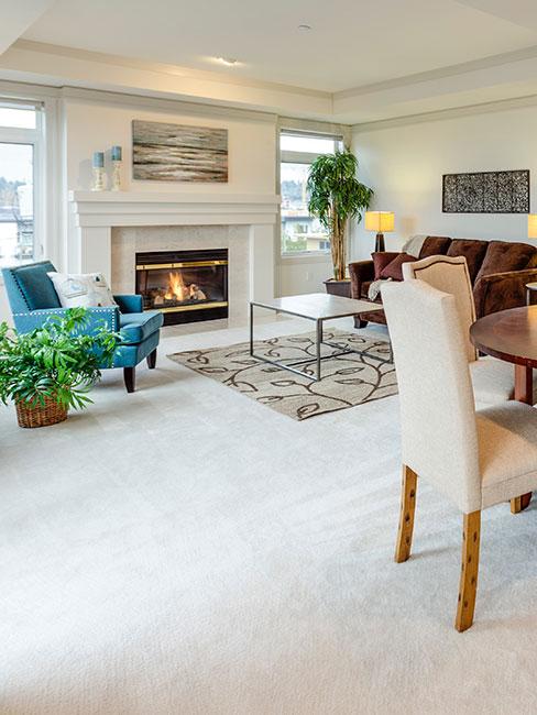 Biały fotel w salonie oraz kominika udekorowanego girlandą