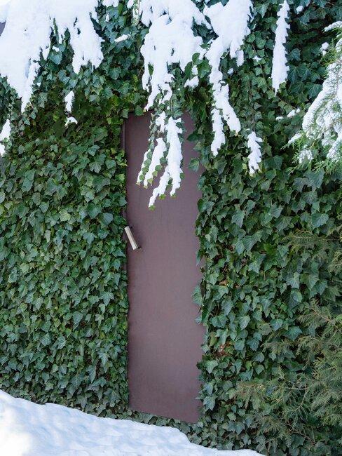 czarna ściana w kuchni ze stołem z drewnianym blatem na którym stoi czarny czajnik