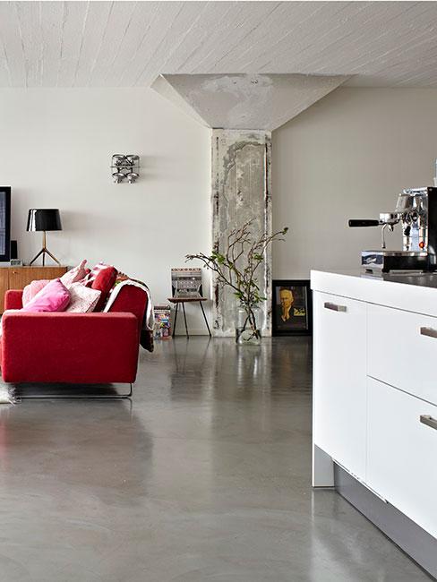 Fragmnet gabinetu w stylu boho z czerwoną sofą oraz dekoracjami