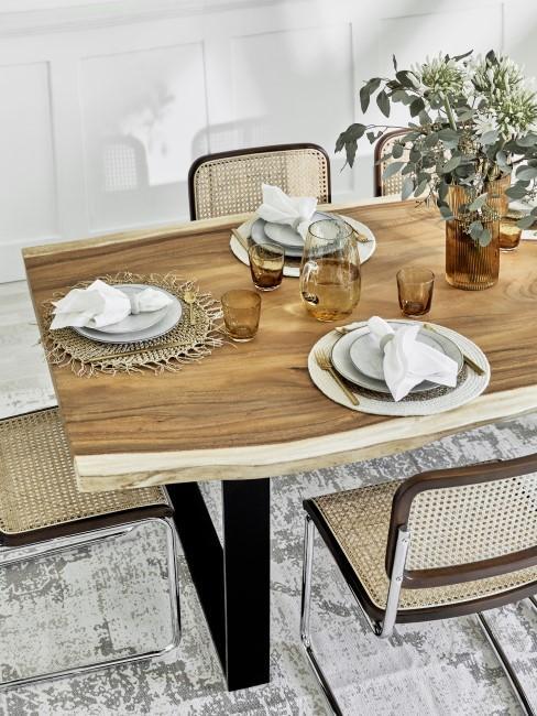 Świątecznie nakrty stół z zieloną girlandą na środku
