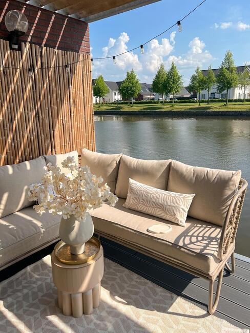Kącik relaksu przed domem, krzesła, stół i pufy