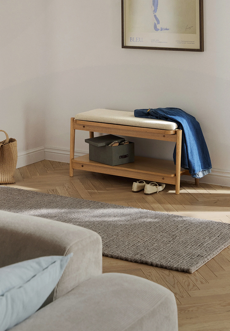 Nowość w naszej serii LIBBY: tapicerowana ławka z wbudowaną półką na buty, idealna do przedpokoju. Zaokrąglone krawędzie i smukła konstrukcja sprawiają, że jest to absolutny klasyk. Dostępna w kolorze jasnego dębu, ciemnego dębu lub czerni.