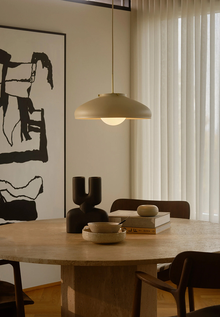Lampa wisząca LATIF, zaprojektowana przez Jonasa Birkebæka Poulsena, łączy w sobie nowoczesną przejrzystość z subtelnymi kontrastami materiałów. Surowy metal, szczotkowane detale z mosiądzu i okrągły dyfuzor z opalu tworzą miękkie światło, które nadaje jadalni nastrojową atmosferę.